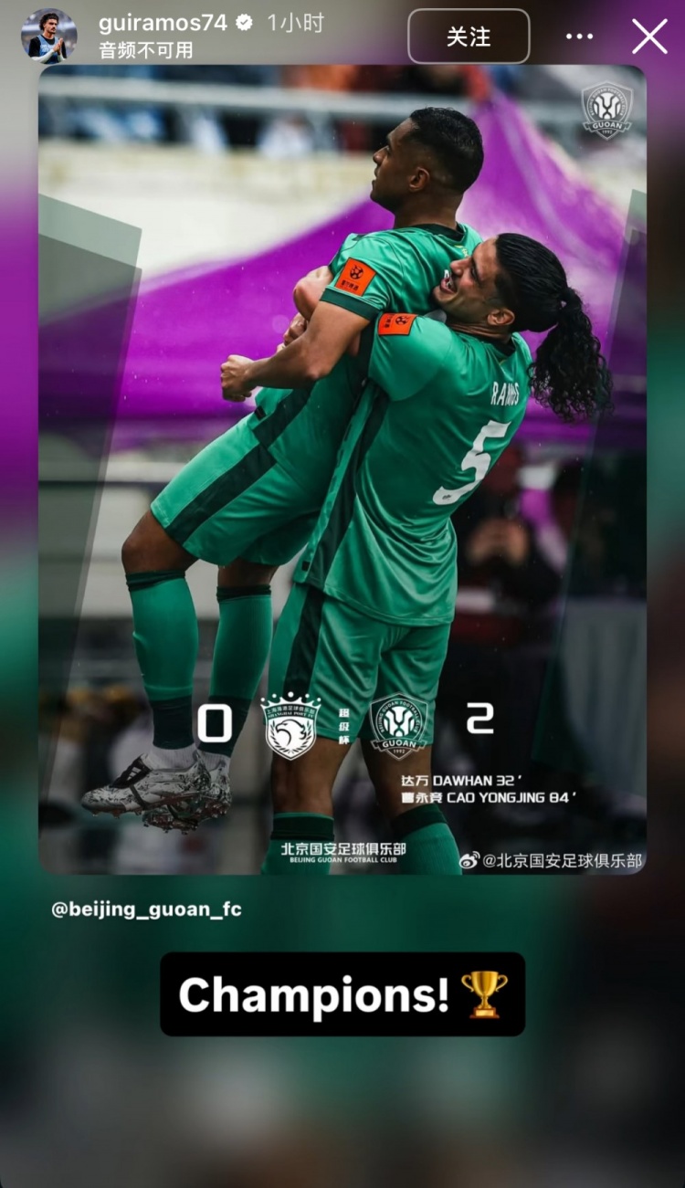 賽后國(guó)安新援吉列爾梅·拉莫斯更新社媒,曬出一張以自己擁抱隊(duì)友慶祝時(shí)的照片為背景的海報(bào),并配文寫道:“冠軍!”