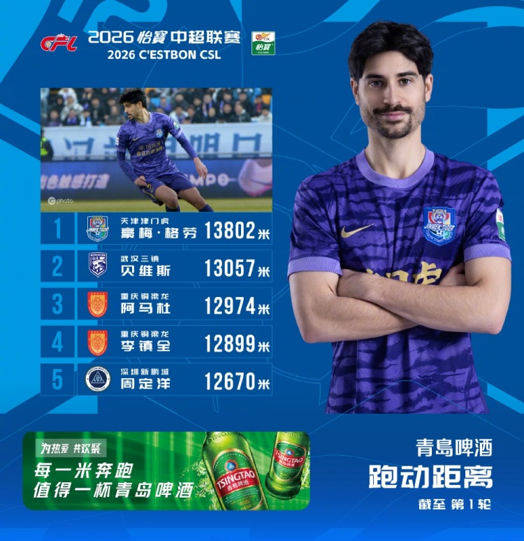 直播吧3月11日訊 今日,中超聯(lián)賽官方公布了首輪聯(lián)賽跑動榜,津門虎外援豪梅·格勞以13802米的跑動距離居首。
