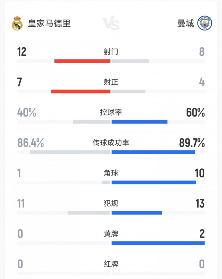 直播吧3月12日訊 歐冠1/8決賽首回合,皇馬3-0曼城。雙方全場重點數(shù)據(jù)對比如下↓(主隊皇馬在前)