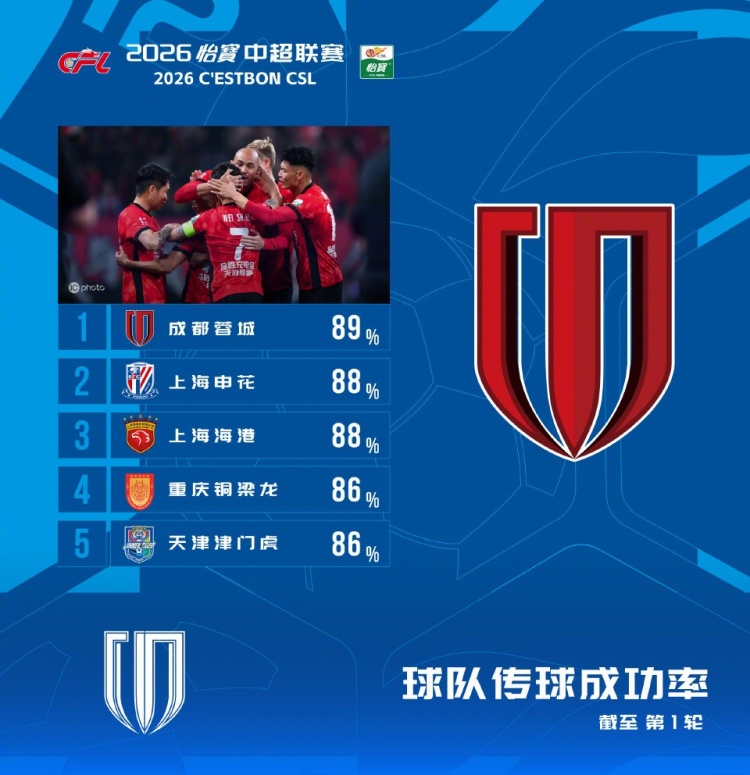 中超首輪傳球成功率排行:成都蓉城89%居首,申花、海港88%隨后