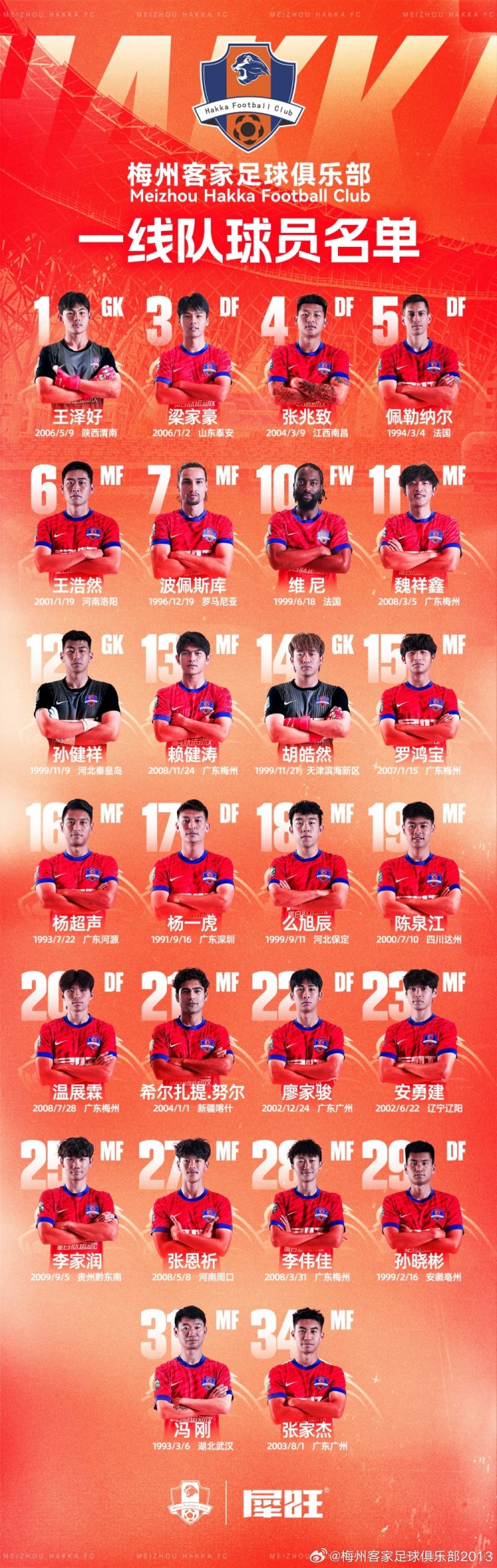 梅州客家新賽季一線隊名單
