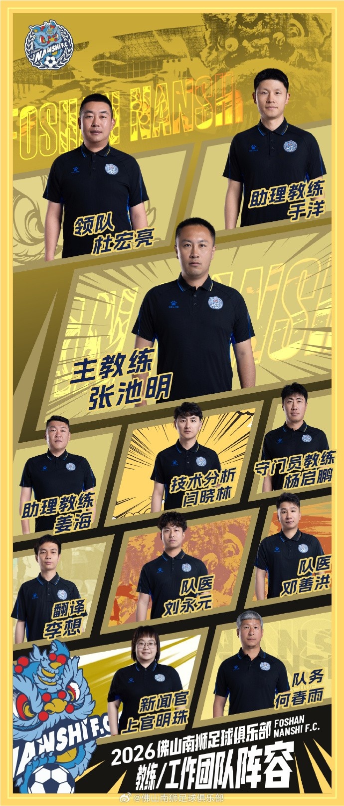 佛山南獅已任命張池明出任一線隊主帥,助理教練的職位上則出現(xiàn)了于洋的名字。