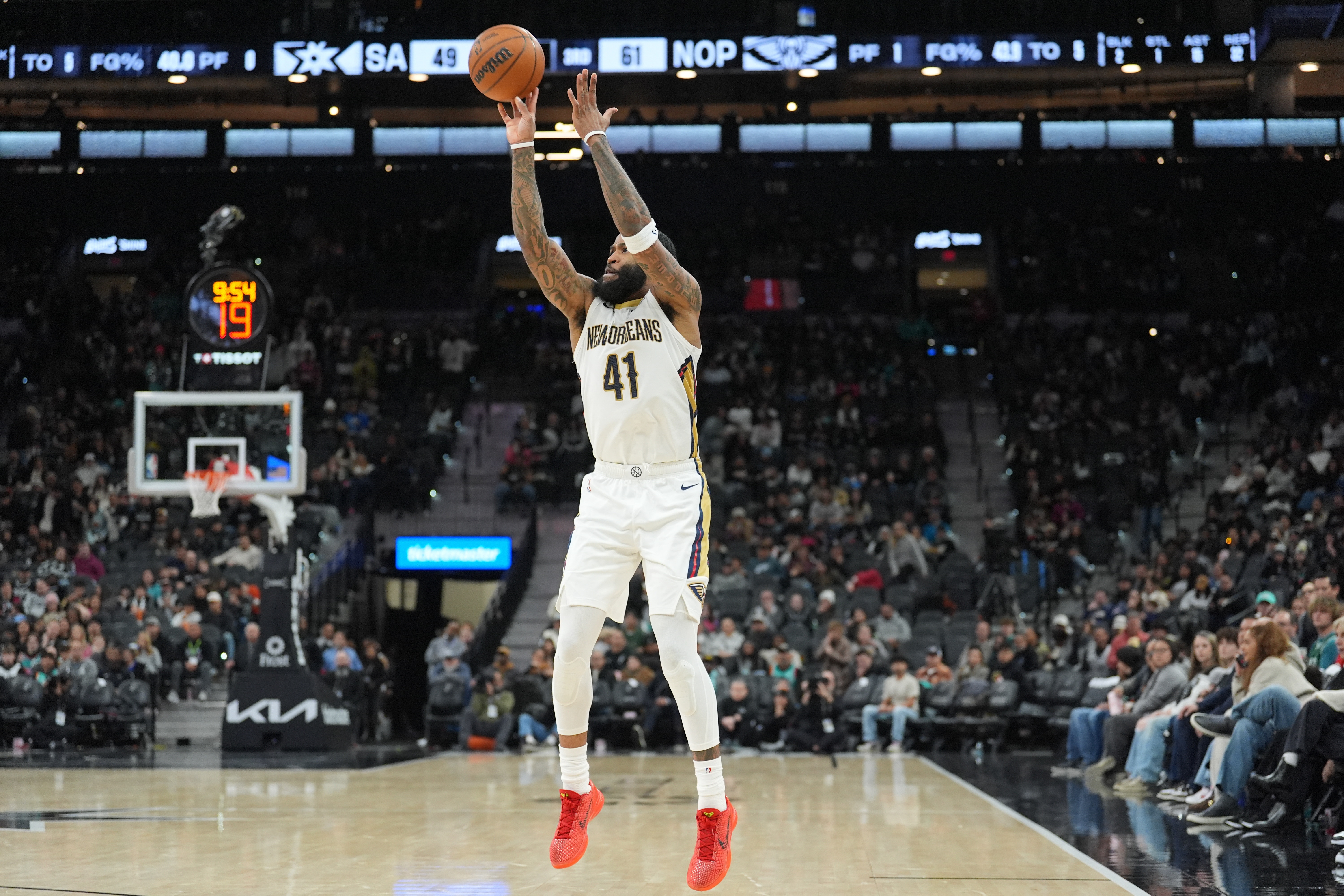 薩迪克·貝發(fā)揮完美,出戰(zhàn)34分鐘20投14中,三分9中5,罰球9中9砍下鵜鶘生涯新高的42分(生涯單場最高是51,在活塞時得到),另有5籃板7助攻。