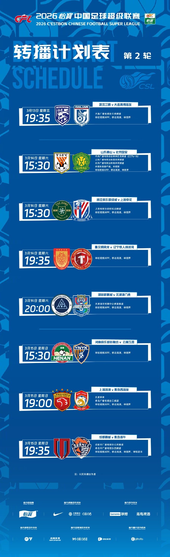 中超第2輪轉(zhuǎn)播計(jì)劃: