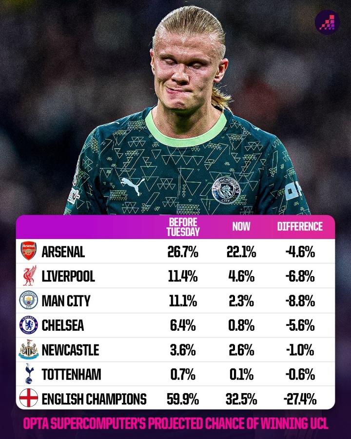報(bào)道稱,在淘汰賽之前,英超球隊(duì)奪得歐冠的概率是59.9%,然而,英超6隊(duì)首回合全部未能取勝,因此這一數(shù)字已經(jīng)降至32.5%。