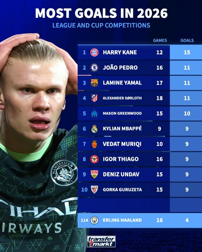直播吧3月12日訊 德轉(zhuǎn)盤點(diǎn)了在2026年五大聯(lián)賽球員在聯(lián)賽+杯賽進(jìn)球榜,其中凱恩15球居首,而哈蘭德僅打進(jìn)4球只位列第114位。具體如下:
