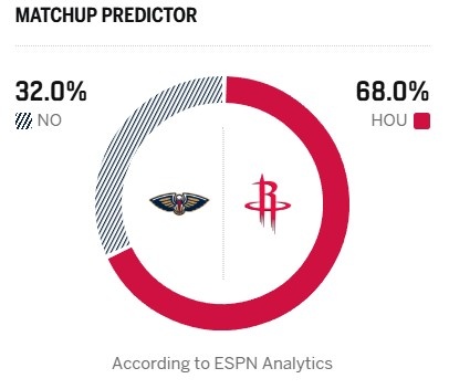 今日ESPN曬出本場勝率預(yù)測,火箭68%占上風(fēng),鵜鶘只有32%。