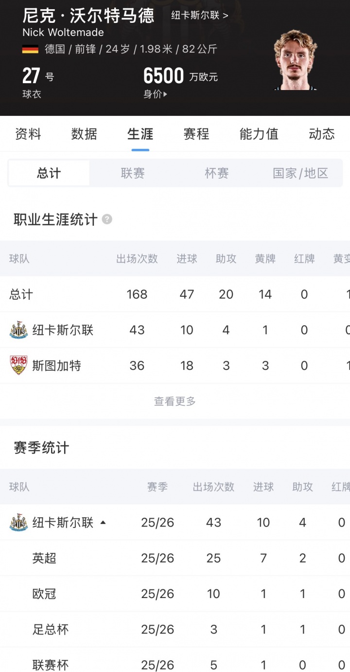 沃爾特馬德本賽季為紐卡出場43次,貢獻(xiàn)10球4助,他與球隊(duì)的合同至2031年,現(xiàn)身價(jià)6500萬歐。