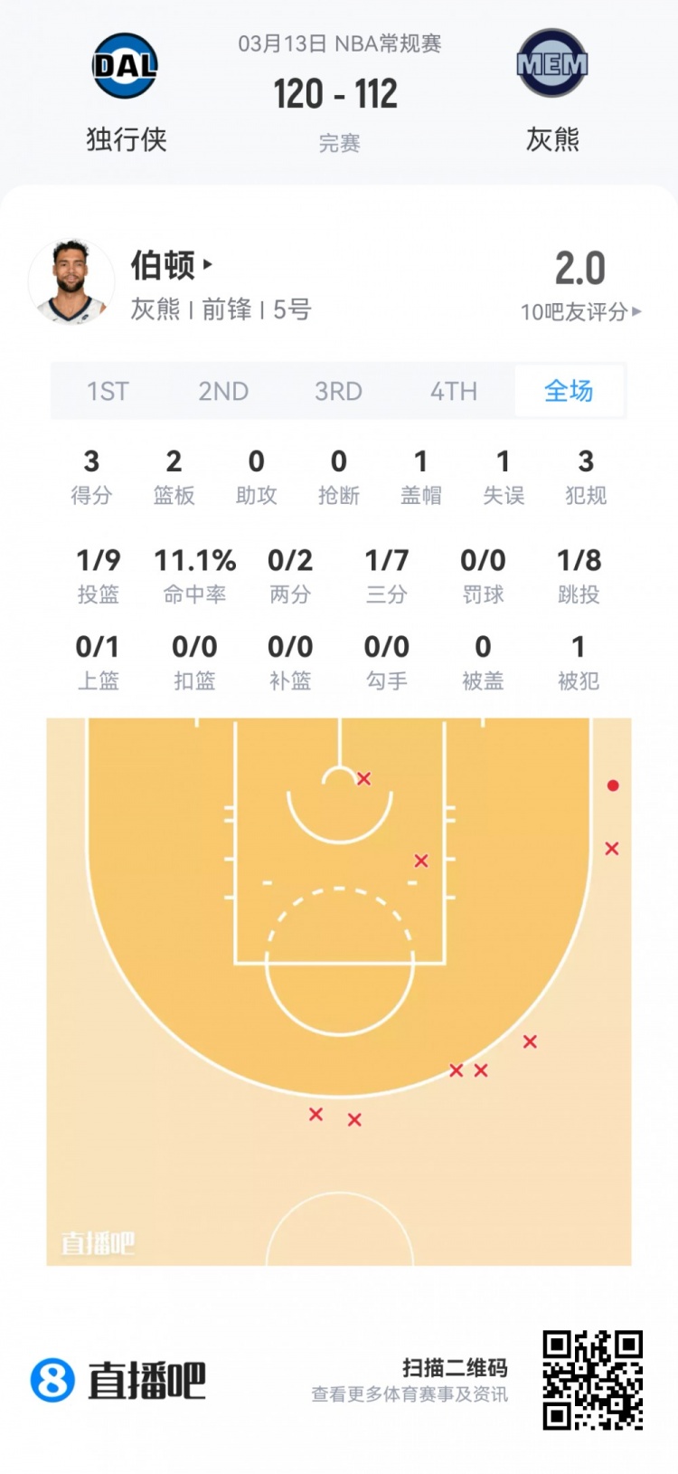 獨(dú)行俠落選秀瑞安·內(nèi)姆哈德 登場13.4分鐘