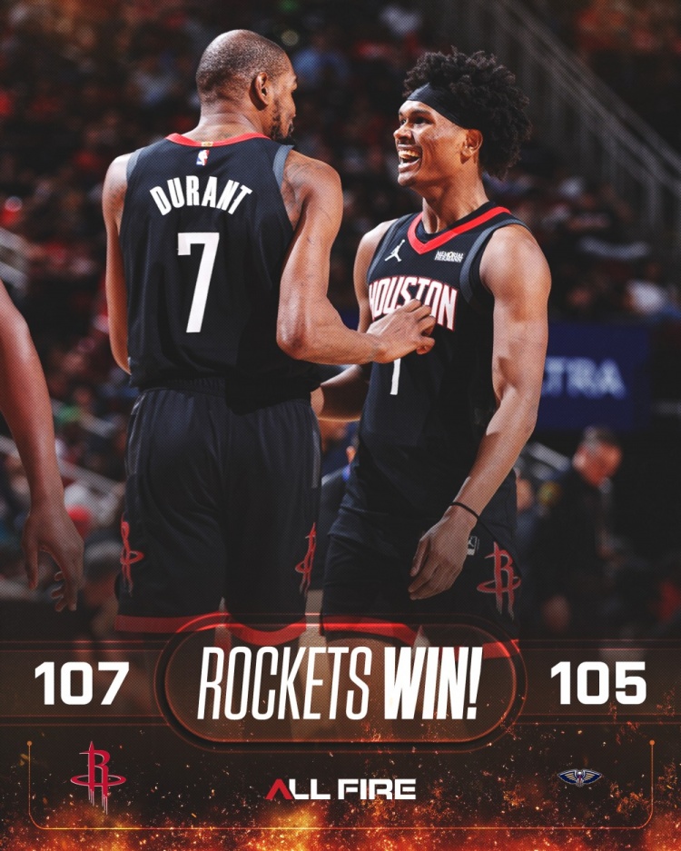 賽后火箭官方發(fā)布贏球海報(bào),杜蘭特和阿門·湯普森成為封面人物。