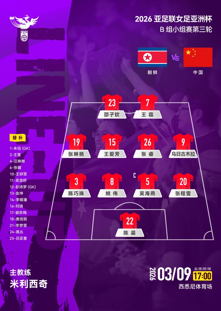 直播吧03月14日訊 2026年女足亞洲杯1/4決賽,中國女足vs中國臺北女足首發(fā)出爐。與小組賽末輪對陣朝鮮的比賽首發(fā)相比,中國女足做出了7人的調(diào)整。彭詩夢頂替受傷的陳晨,鋒線吳澄舒先發(fā),右后衛(wèi)換李夢雯。