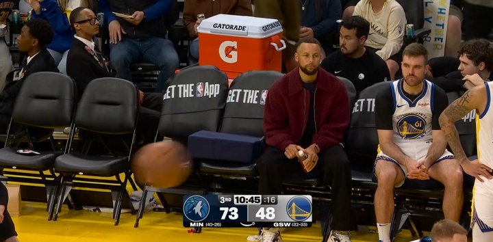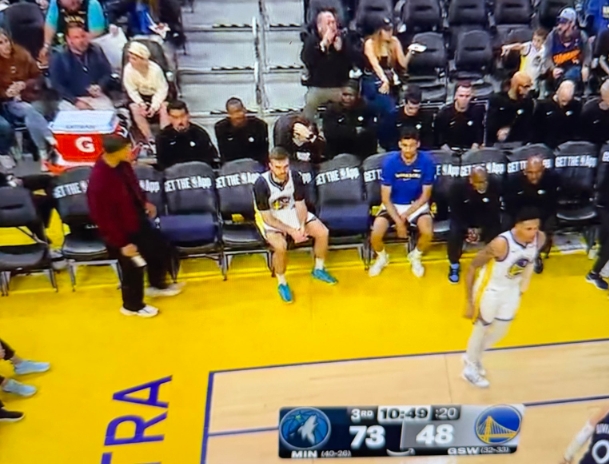 勇士替補席還剩庫里(傷缺)、斯潘塞、萊昂斯三個人。