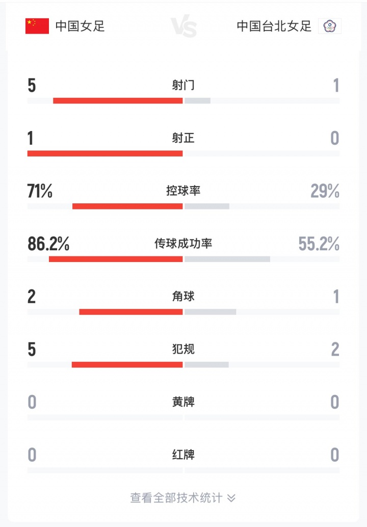 直播吧03月14日訊 女足亞洲杯1/4決賽,中國女足vs中國臺北女足。半場數(shù)據(jù)顯示,中國女足控球率71%-29%,射門5-1,射正1-0,王霜進(jìn)球被吹。