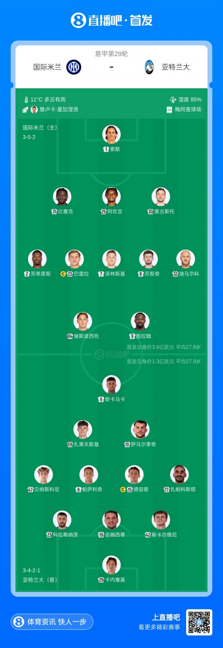 直播吧03月14日訊 北京時(shí)間22點(diǎn),意甲第29輪,國(guó)米vs亞特蘭大,賽前雙方首發(fā)公布!