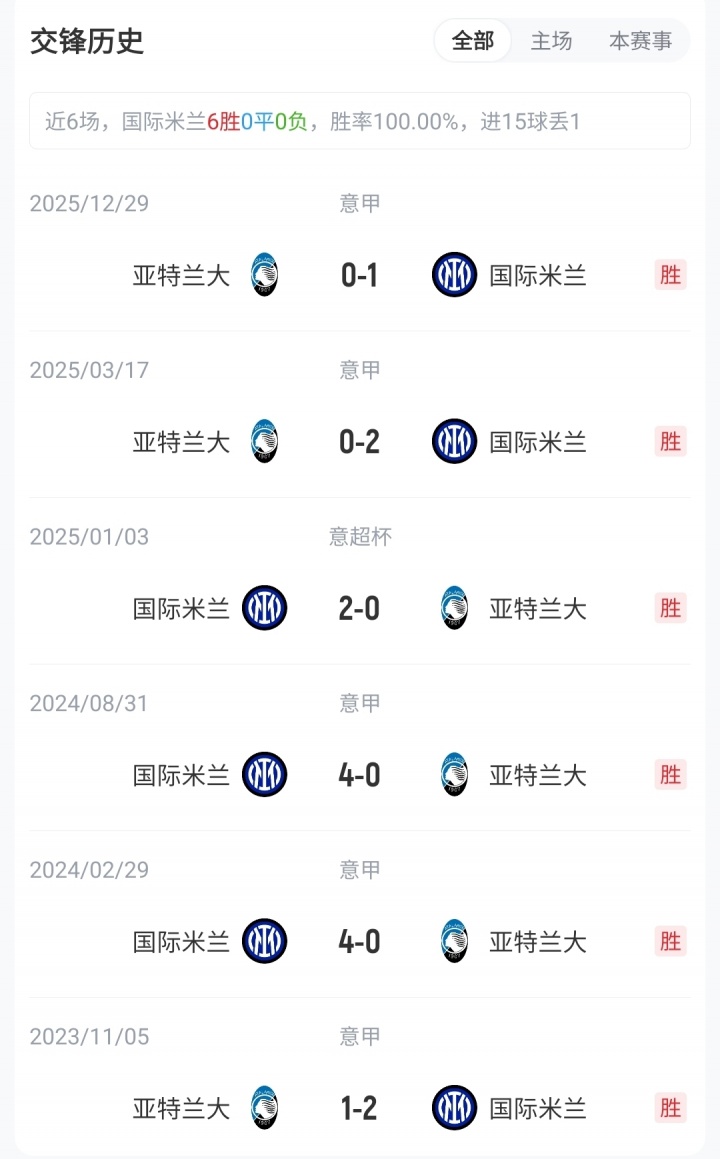 目前意甲積分榜上,國(guó)米22勝1平5負(fù)積67分,位列第1;亞特蘭大12勝10平6負(fù)積46分,位列第7。雙方賽季首次交鋒,國(guó)米客場(chǎng)1-0擊敗亞特蘭大。