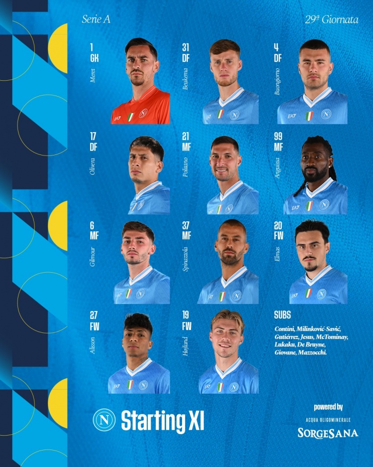 那不勒斯首發(fā):1-梅雷特;31-別克馬、4-布翁喬爾諾、17-奧利維拉;21-波利塔諾、99-安古伊薩、6-吉爾莫、37-斯皮納佐拉、20-埃爾馬斯;27-阿利松·桑托斯、19-霍伊倫