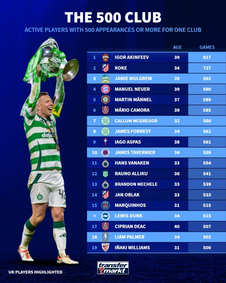 在現(xiàn)役球員中,為單一俱樂部至少出戰(zhàn)500場(chǎng)比賽的球員中,阿金費(fèi)耶夫以817場(chǎng)居首,科克以727場(chǎng)位居次席,諾伊爾則以590次位居第4位。