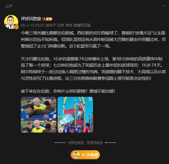 直播吧03月15日訊 本輪英超,阿森納2-0戰(zhàn)勝埃弗頓,切爾西0-1不敵紐卡斯?fàn)柭?lián),著名評述員詹俊先生在社媒發(fā)表點評。