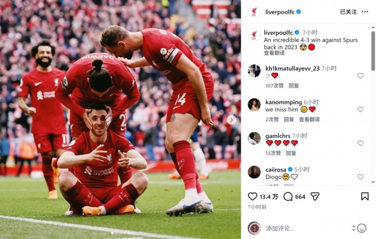 利物浦官方社媒曬出若塔那場(chǎng)比賽慶祝進(jìn)球的照片,緬懷這位去世的前鋒,配文:“2023年那場(chǎng)不可思議的4-3擊敗熱刺的比賽?!?/p>