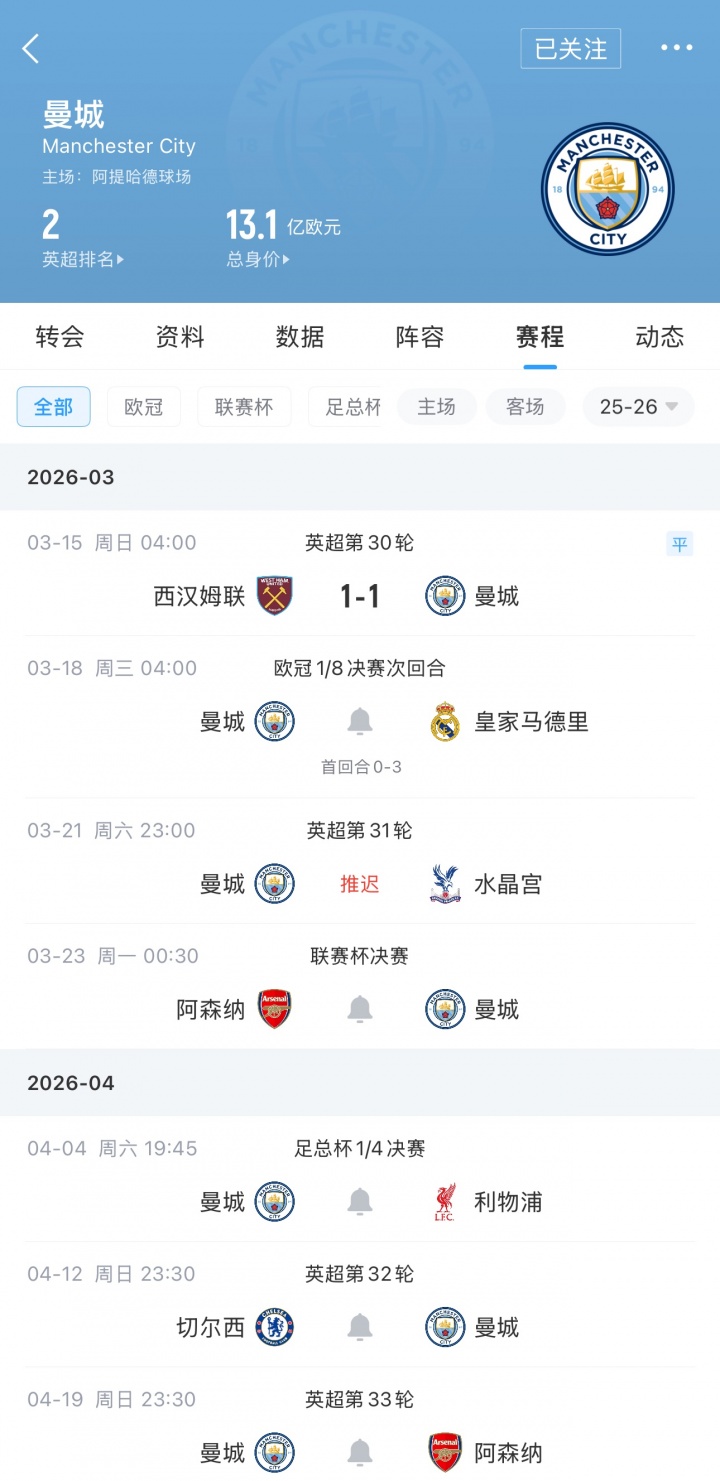 直播吧03月15日訊 英超第30輪,曼城客場(chǎng)1-1戰(zhàn)平西漢姆聯(lián),遭遇聯(lián)賽2連平丟4分,現(xiàn)少賽1場(chǎng)已落后榜首阿森納9分!