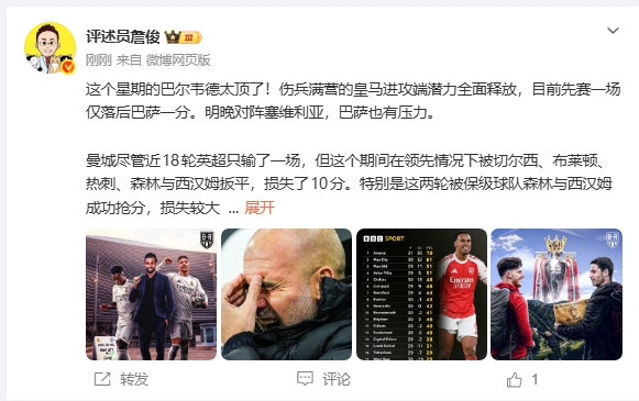 直播吧03月15日訊 本輪英超結(jié)束多場(chǎng)對(duì)陣,阿森納2-0埃弗頓,曼城1-1西漢姆。賽后評(píng)述員詹俊發(fā)文。