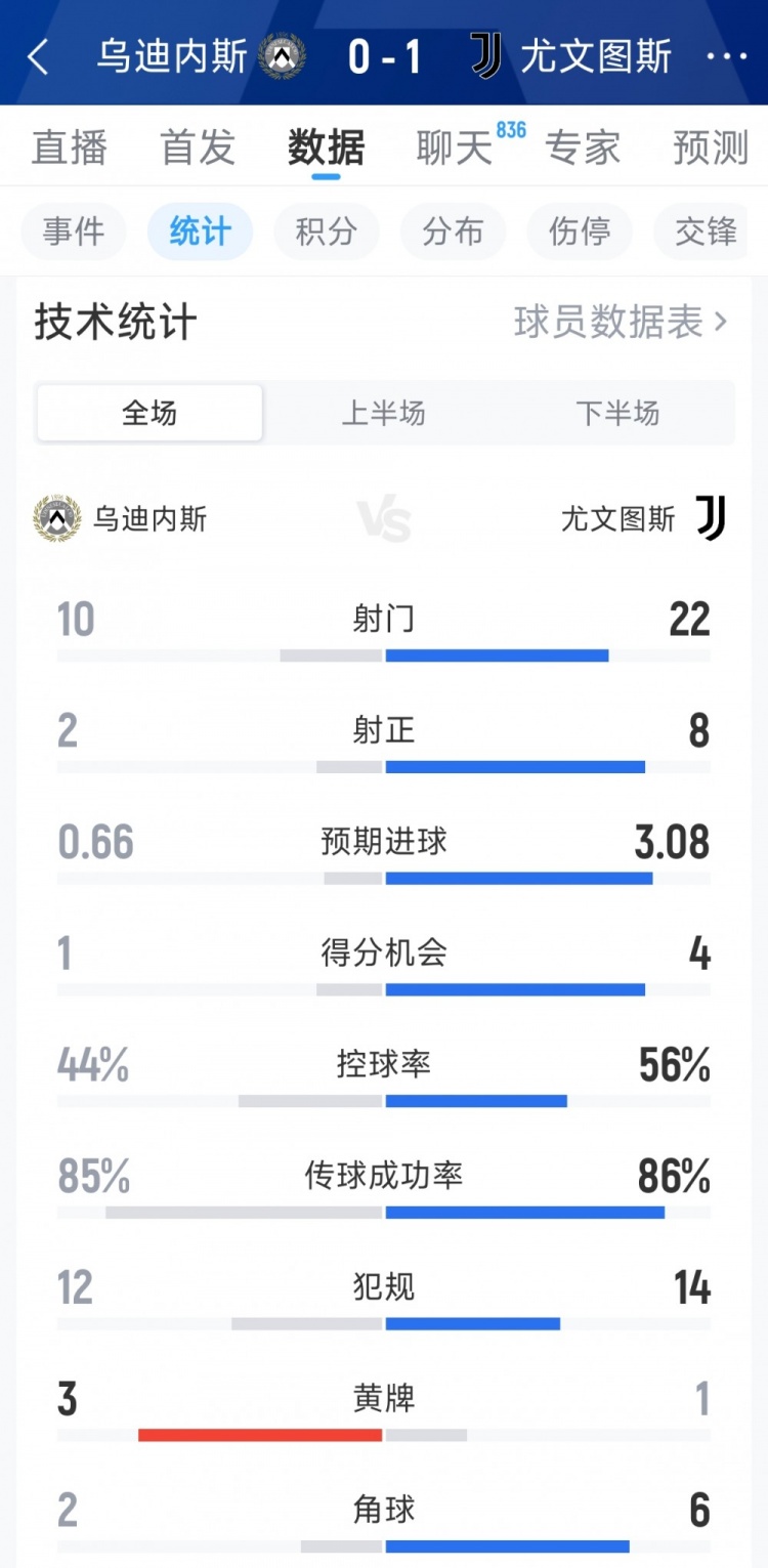 直播吧3月15日訊 在本輪意甲,尤文1-0擊敗烏迪內斯,以下為雙方全場數(shù)據(jù)對比: