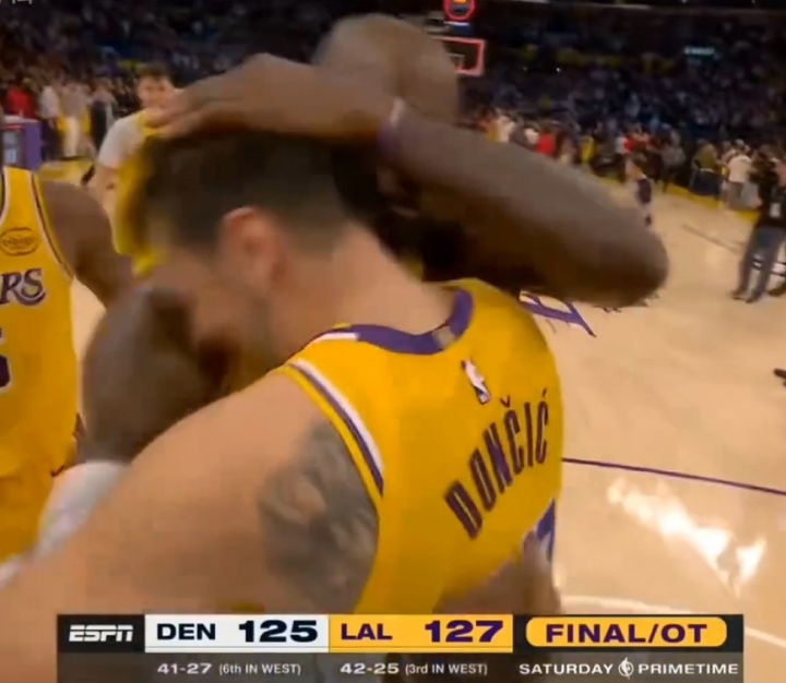 ??愛你!比賽結(jié)束后詹姆斯第一時間從后場狂奔回去和東契奇擁抱