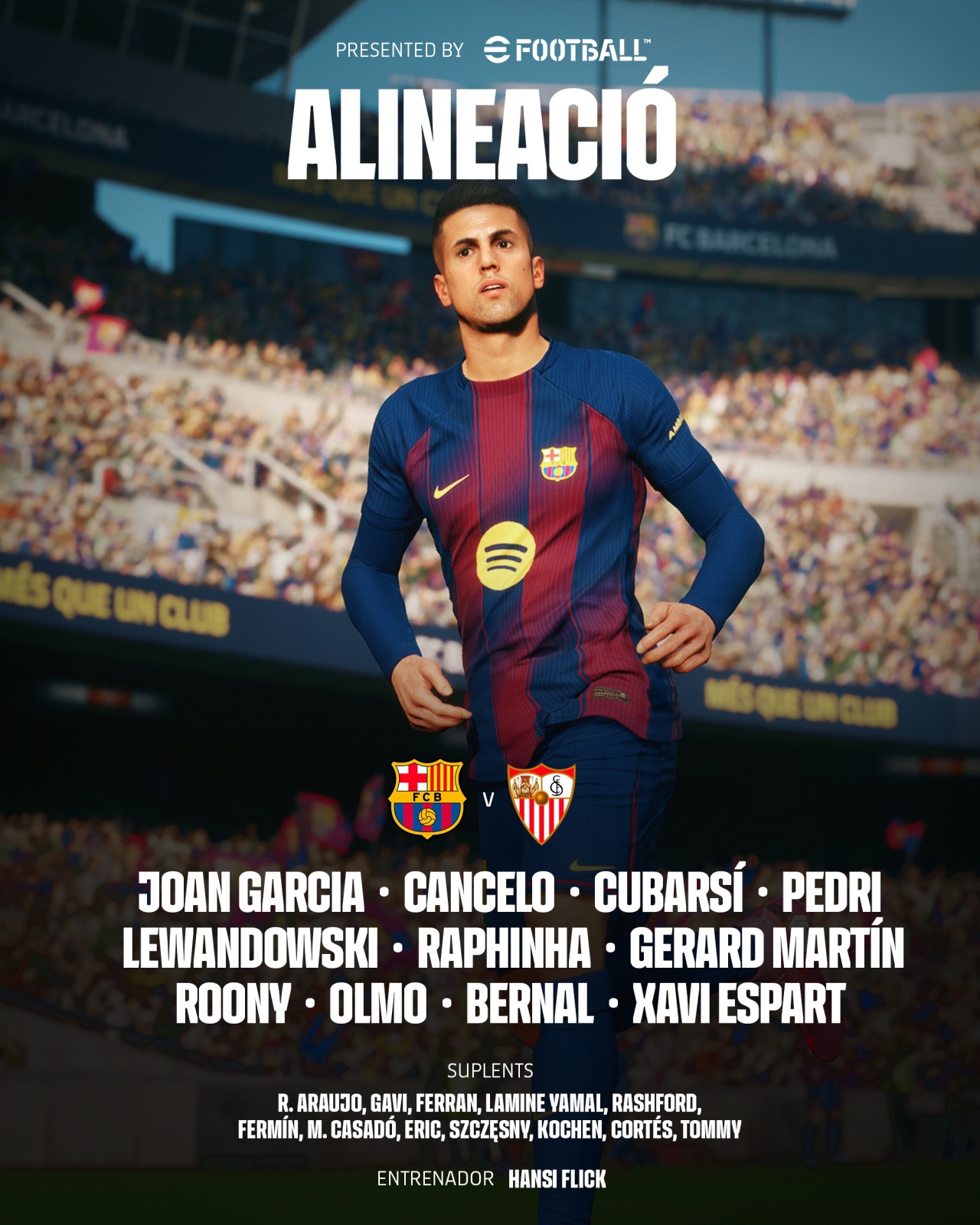 巴薩vs塞維利亞首發(fā):萊萬先發(fā)亞馬爾替補,18歲埃斯帕特登場
