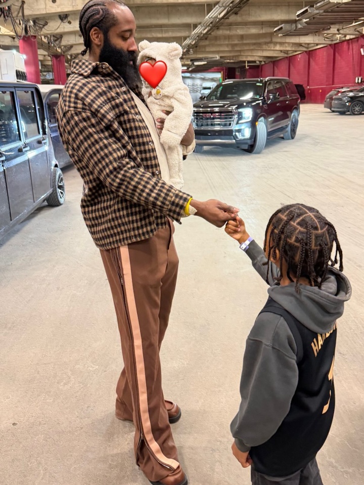 超級(jí)奶爸!女友曬哈登抱著孩子和自己的孩子拉手指