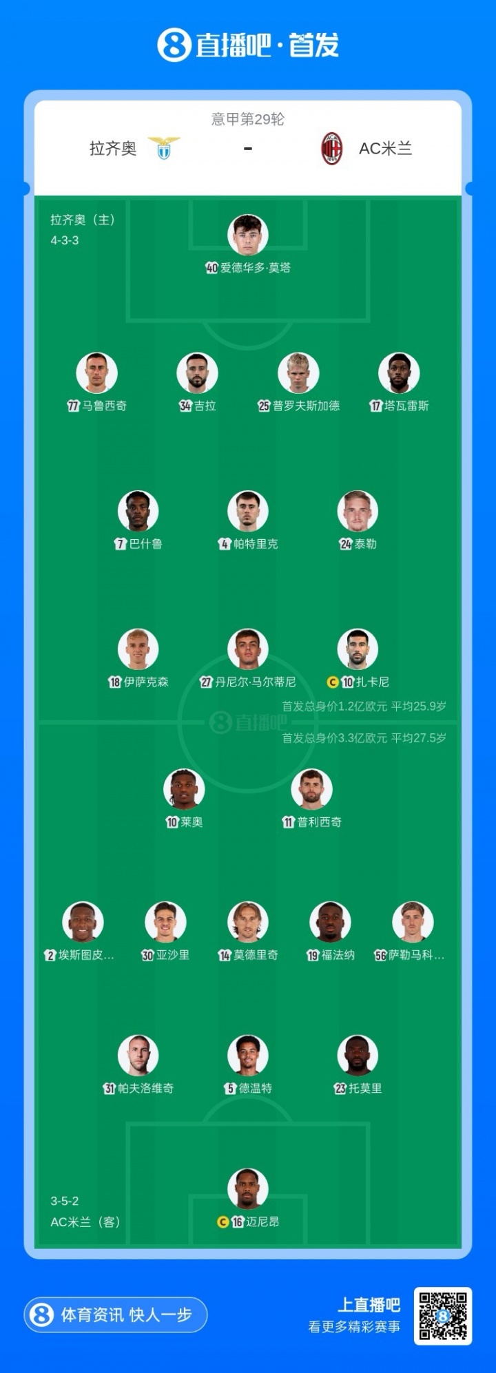 拉齊奧首發(fā):40-愛德華多·莫塔、77-馬魯西奇、34-吉拉、25-普羅夫斯加德、17-塔瓦雷斯、7-巴什魯、4-帕特里克、24-泰勒、18-伊薩克森、27-丹尼爾·馬爾蒂尼、10-扎卡尼