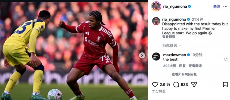直播吧3月16日訊 在本輪英超聯(lián)賽的一場比賽中,利物浦主場1-1踢平托特納姆熱刺,賽后,在比賽中首發(fā)出場的紅軍小將恩古莫哈在社媒上發(fā)文。