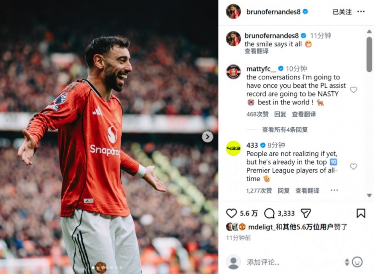 本場比賽B費(fèi)助攻雙響,賽后他也在個人社媒曬出本場慶祝照,配文寫道:“微笑說明了一切!”