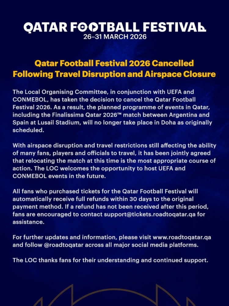 當(dāng)?shù)貢r間3月16日,當(dāng)?shù)亟M織委員會與歐足聯(lián)和南美足聯(lián)協(xié)商后,決定取消2026年卡塔爾足球節(jié)。因此,原定在卡塔爾舉行的一系列活動,包括在盧塞爾體育場進(jìn)行的阿根廷對陣西班牙的2026年卡塔爾歐美杯比賽,將不再按原計劃在多哈舉行。