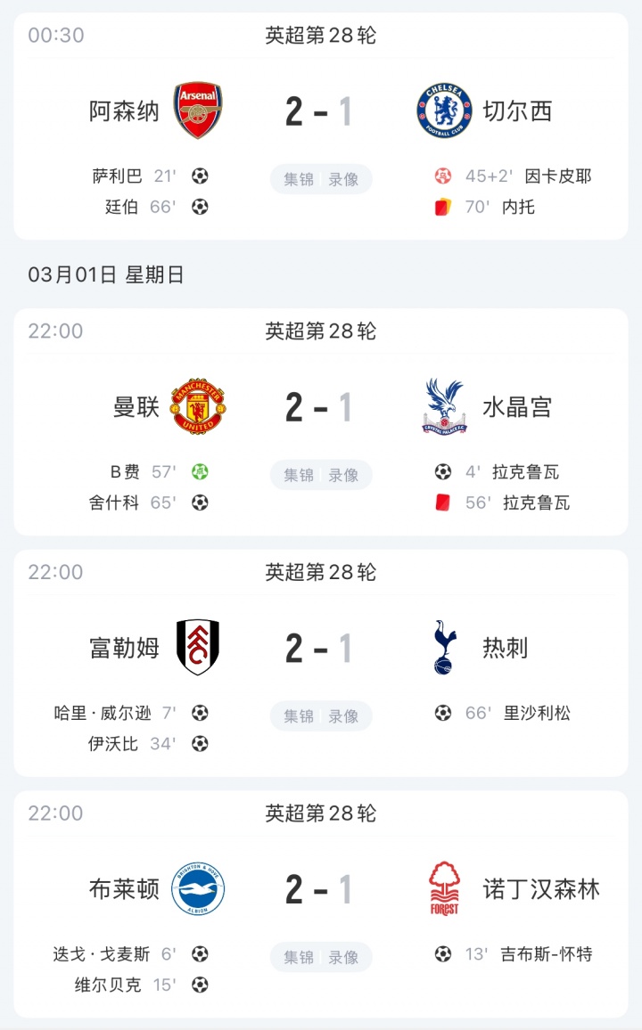 直播吧03月02日訊 英超第28輪,阿森納2-1切爾西、曼聯(lián)2-1水晶宮、富勒姆2-1熱刺,布萊頓2-1諾丁漢森林,詹俊做出點(diǎn)評(píng)。