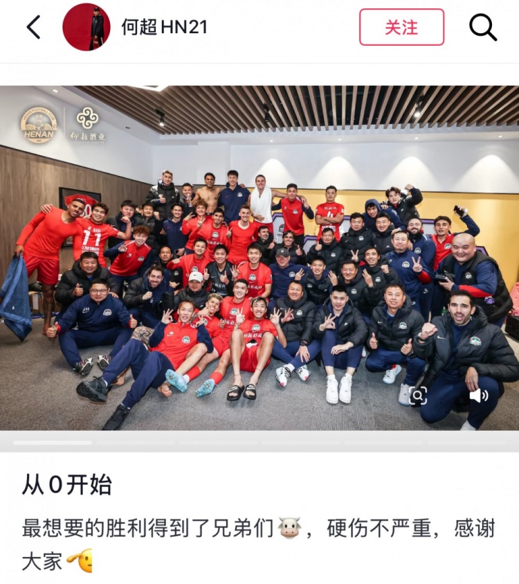 賽后為河南隊首發(fā)的何超更新社媒,曬出全隊賽后在更衣室慶祝的照片和比賽照等,并配文寫道:“從0開始。最想要的勝利得到了,兄弟們,硬傷不嚴(yán)重,感謝大家?!?/p>
