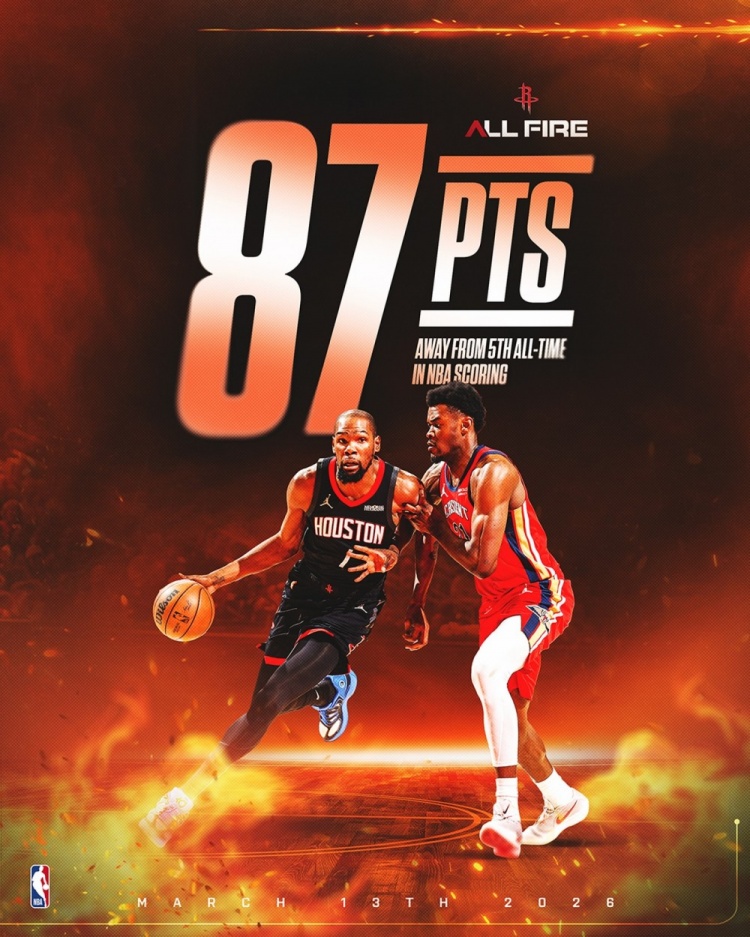 直播吧3月16日訊 近日火箭官方曬出動態(tài)顯示,杜蘭特生涯總得分還差87分就將超越歷史第五的喬丹。