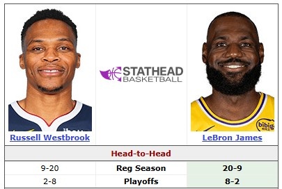 據(jù)統(tǒng)計(jì),詹姆斯和威少生涯共在常規(guī)賽交手29次,詹姆斯20勝9負(fù)占據(jù)上風(fēng)。