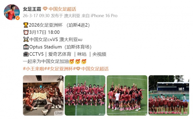 賽前,王霜在個人微博中發(fā)布預(yù)熱信息,并寫道:一起來為中國女足加油。
