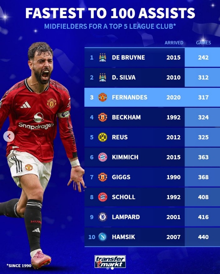 直播吧3月2日訊 在本輪英超,曼聯(lián)2-1擊敗水晶宮,B費送出助攻,這也是他曼聯(lián)生涯317次出場送出的第100次助攻。以下為五大聯(lián)賽中場球員為單一球隊送出100次助攻最快用時榜: