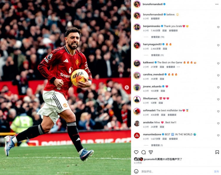 本場比賽B費(fèi)傳射建功,賽后他也在個人社媒曬出慶祝照片,配文寫道:“紅魔信念!”本場比賽接B費(fèi)助攻破門的舍什科也評論道:“感謝兄弟?!?/p>