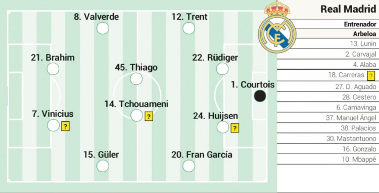 附阿斯預(yù)測皇馬首發(fā):1-庫爾圖瓦;20-弗蘭·加西亞、24-赫伊森、22-呂迪格、12-阿諾德;15-居萊爾、14-瓊阿梅尼、45-蒂亞戈·皮塔奇、8-巴爾韋德;7-維尼修斯、21-卜拉欣·迪亞斯