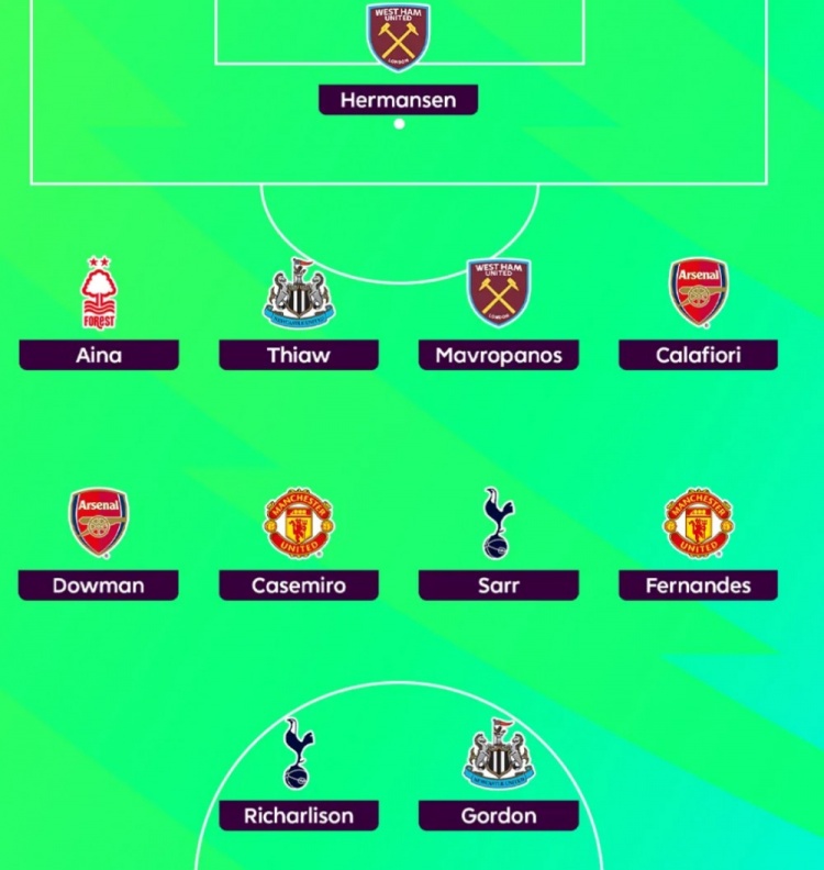 后衛(wèi):埃納(諾丁漢森林)、佳夫(紐卡)、馬夫羅帕諾斯(西漢姆聯(lián))、卡拉菲奧里(阿森納)