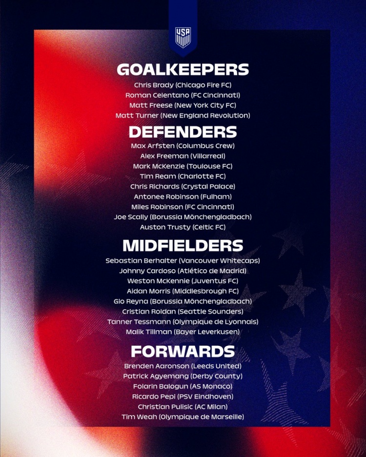 后衛(wèi):馬克斯·阿夫斯坦(哥倫布機(jī)員)、亞歷克斯·弗里曼(比利亞雷亞爾)、馬克·麥肯齊(圖盧茲)、蒂姆·里姆(夏洛特FC)、克里斯·理查茲(水晶宮)、安東尼·羅賓遜(富勒姆)、邁爾斯·羅賓遜(辛辛那提FC)、喬·斯卡利(門興)、奧斯頓·特魯斯蒂(凱爾特人)
