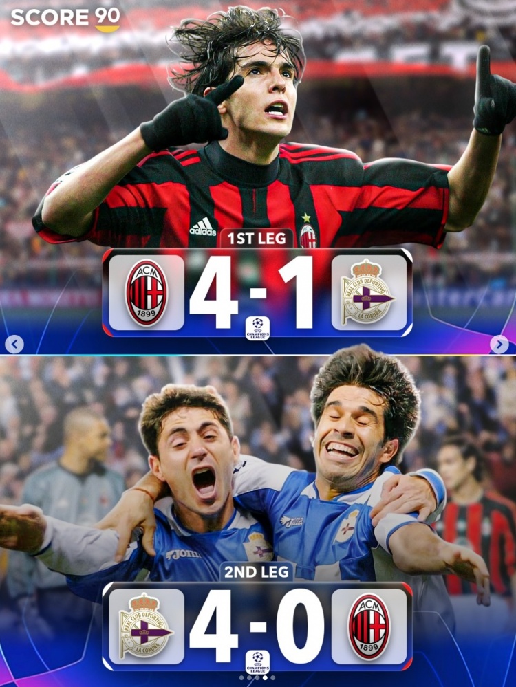 首回合米蘭4-1拉科魯尼亞,次回合拉科魯尼亞4-0米蘭