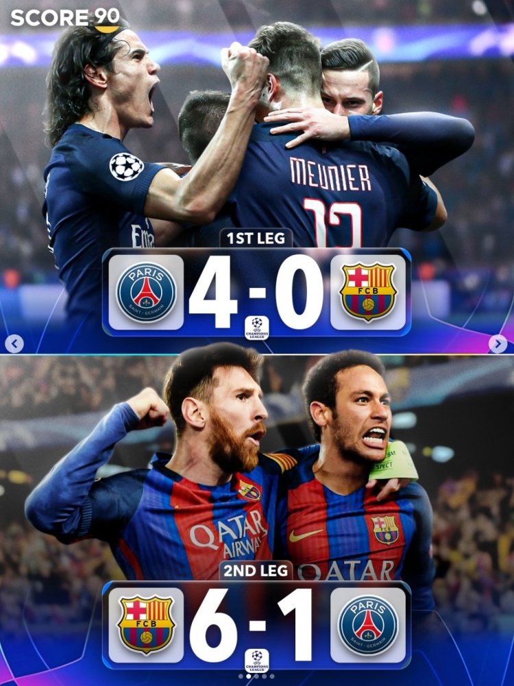 首回合巴黎圣日耳曼4-0巴薩,次回合巴薩6-1巴黎圣日耳曼