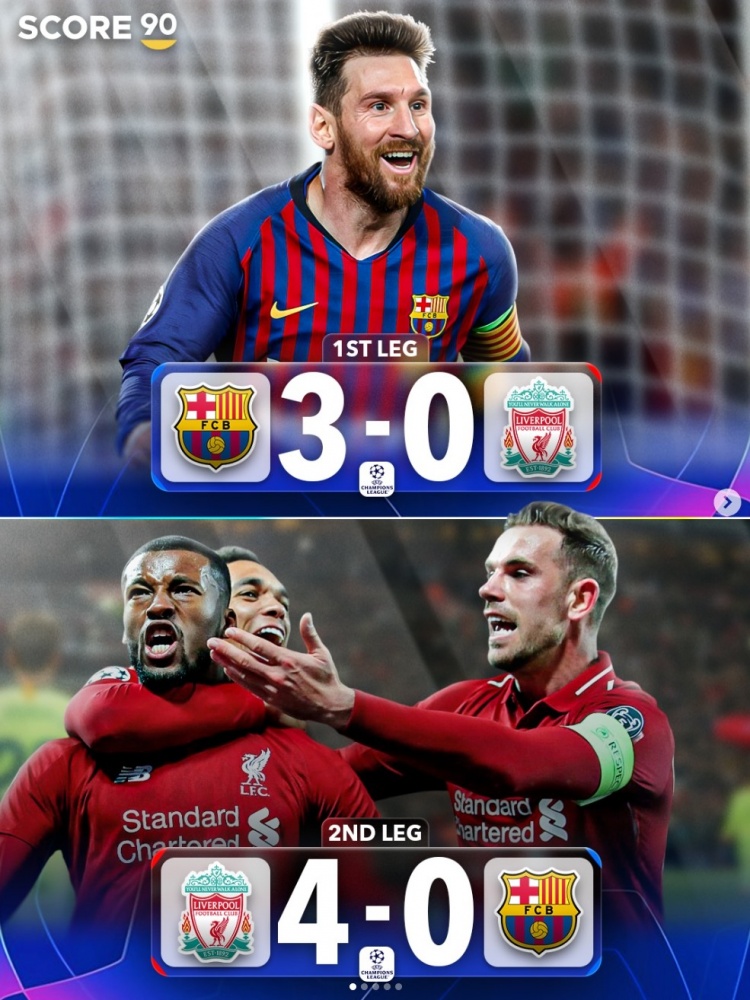 歐冠淘汰賽歷史僅4次落后3球最終逆轉:18-19利物浦 16-17巴薩在列
