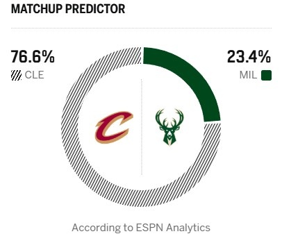 今日ESPN給出了本場(chǎng)比賽的勝率預(yù)測(cè),騎士高達(dá)76.6%,雄鹿只有23.4%。