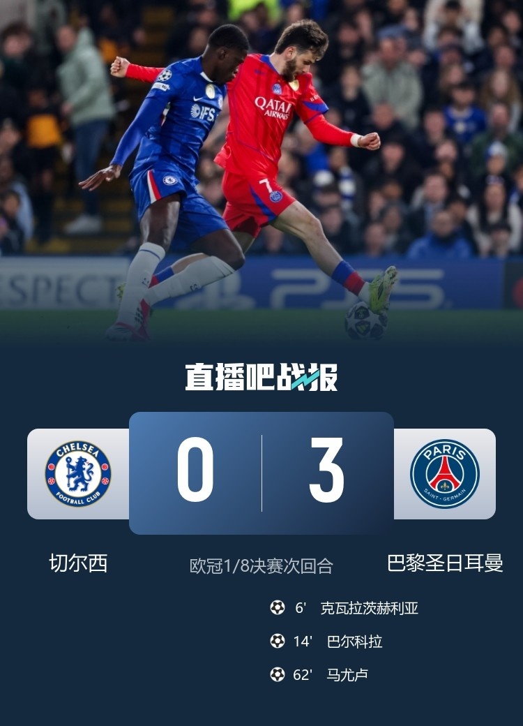 直播吧3月18日訊 歐冠1/8決賽次回合,切爾西主場0-3不敵巴黎圣日耳曼,總比分2-8不敵對手,無緣八強。