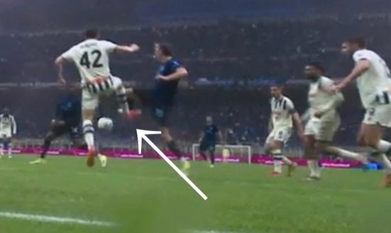 VAR裁判室: “讓我看之前那個角度:這里他踢到了球,國米球員也碰到了。動作很輕。讓我看動態(tài)回放:他的腿是彎曲的……檢查完畢,動作很輕,雖然有接觸但非常輕微。觸碰極小,并不是踢了一腳。”