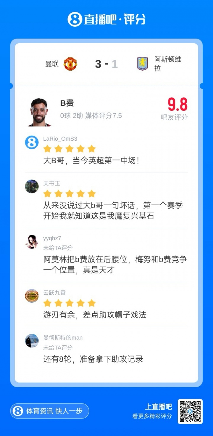 這是B費本賽季第5次當選【直播吧X咪咕體育英超每輪MVP】評選最佳。吧友熱評:游刃有余,差點助攻帽子戲法!大B哥當今英超第一中場!
